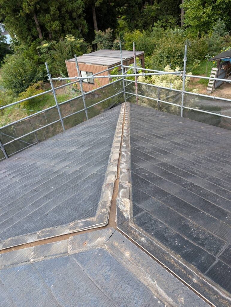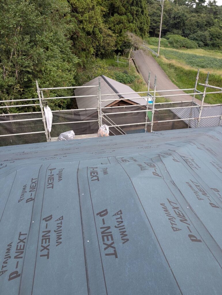 写真でもわかる通り、屋根全体に丁寧にシートを貼り込み、重なり部分や棟周り、取合い部分もしっかりと処理を行いました。屋根工事の要はこの防水シートで、雨漏り防止のためには絶対に欠かせない工程です。